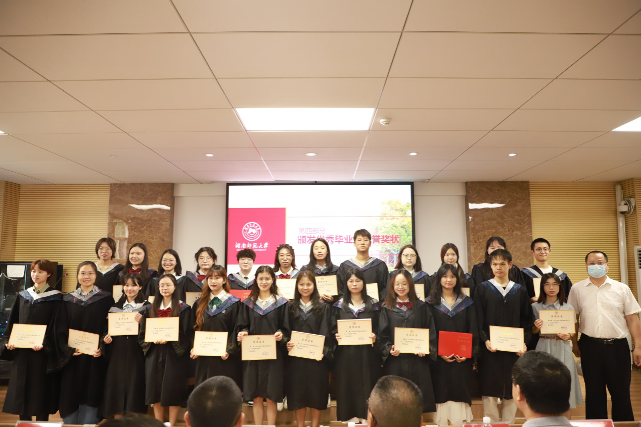 李翠玲宣读对生科院2023届优秀毕业生以及优秀毕业论文的表彰决定,蒋能胜与彭赛丰分别为省级、校级优秀毕业生们颁发荣誉奖状,陈湘定为优秀毕业论文获得者颁发奖状,同时,李云龙向生科院校友联络员颁发聘书,胡胜标为优秀学生代表颁发毕业证和学位证并进行合影。