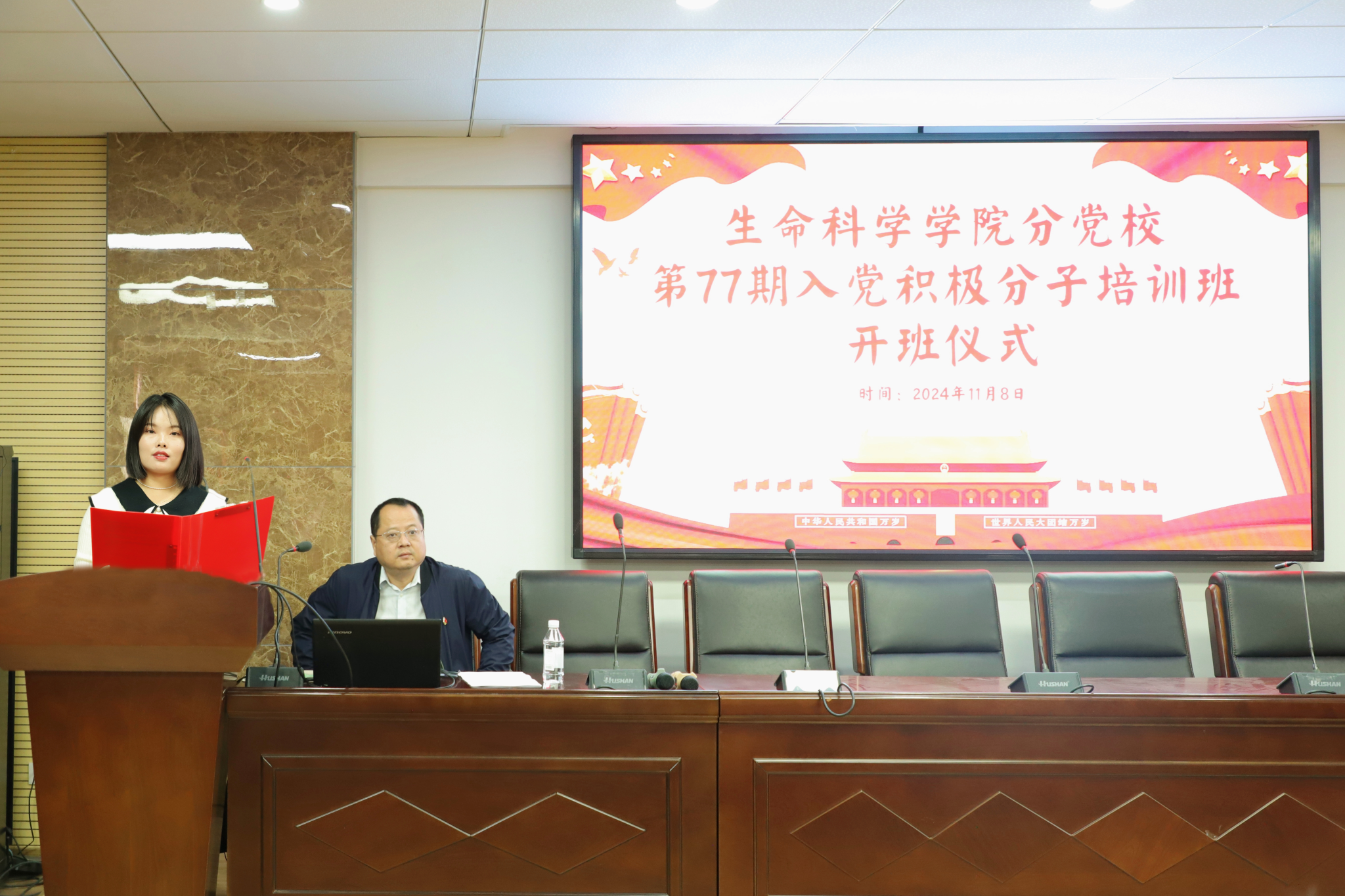 仪式第三项,培训班负责人吴晴详细介绍了本次培训的内容及纪律要求。培训内容涵盖党的历史、党的理论、党的章程等多个方面,通过集中授课、小组讨论、社会实践、心得撰写等多种形式进行。同时,强调了培训纪律,要求学员们严格遵守《湖南师范大学党员党校培训班学员守则》,认真听讲、积极参与讨论,按时完成各项学习任务。她希望全体学员通过党课培训学习,进一步坚定理想信念、增强理论学习的自觉性,充分发挥先锋模范作用,早日实现自己的政治理想。