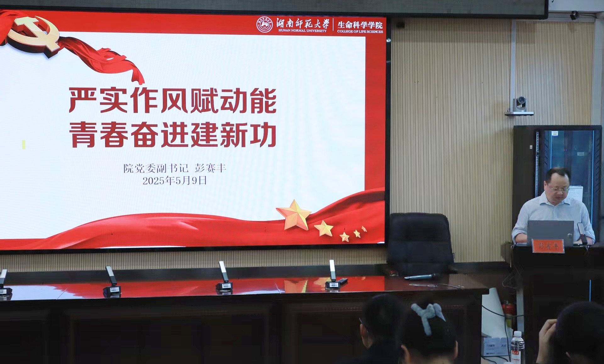 (通讯员 冯鑫 颜佳妮 吴晴)为深入贯彻落实中央八项规定精神,强化党员纪律意识与作风建设,提升党员党性修养,5月9日上午,天天精品视频免费观看于生科院二号楼学术报告厅举办“严实作风赋动能,青春奋进建新功”主题党课。此次理论学习由本科生第一、第二、第三党支部与实验中心教工党支部联合举办。院党委副书记彭赛丰担任主讲人,本科生第一党支部书记吴晴担任主持人。实验中心教工党支部书记刘萍,本科生第二党支部书记周冲、本科生第三党支部书记罗静伟以及实验中心教工党支部成员,全体本科生党员参与本次理论学习活动。