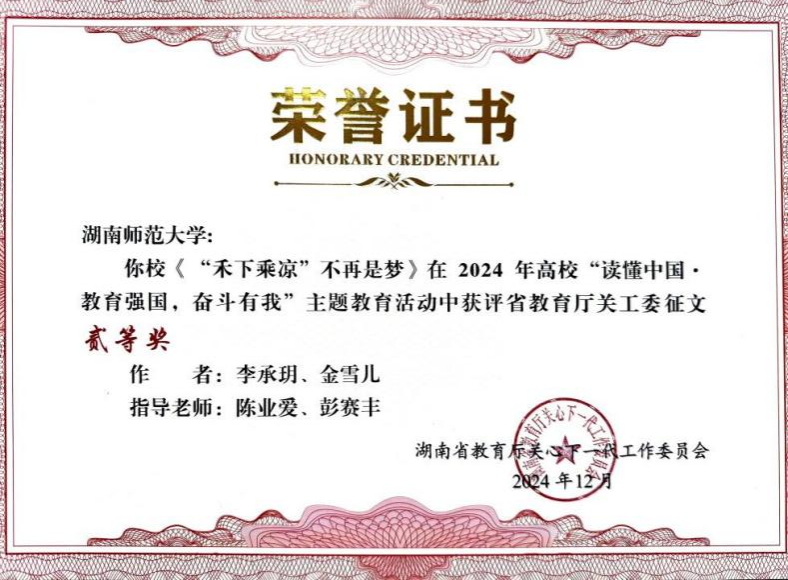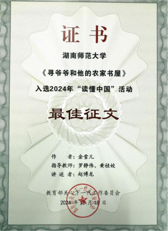此外,金雪儿同学的作品《寻爷爷和他的农家书屋》脱颖而出,荣获教育部关工委“最佳征文”以及湖南省教育厅关工委“征文特等奖”。优秀教师罗静伟、黄桂姣全程指导,金雪儿同学以细腻且真挚的笔触,深刻传递出新时代青年的家国情怀。