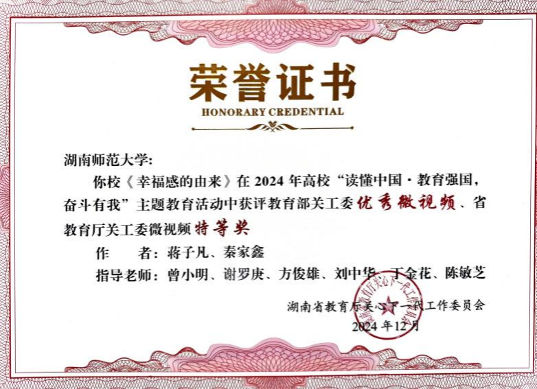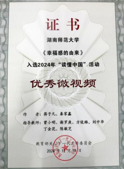 在微视频类评选中,蒋子凡、秦家鑫团队的作品《幸福感的由来》表现卓越,一举夺得教育部关工委“优秀微视频”与湖南省教育厅关工委“微视频特等奖”两项殊荣。该作品在曾小明、谢罗庚、方俊雄、刘中华、丁金花、陈敏芝等教师的悉心指导下,以独特的创新视角,深入诠释了新时代的幸福内涵。