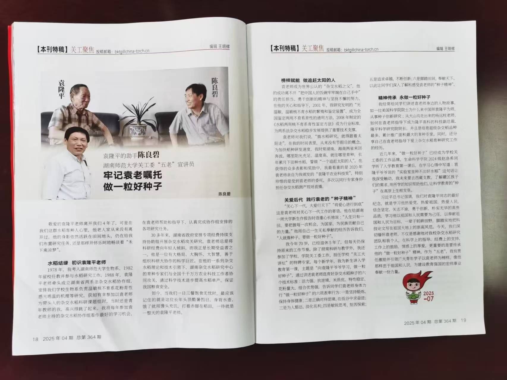 (通讯员 韩淑婷 罗静伟) 近日,中国关工委工作刊物《中国火炬》刊发了我院教授陈良碧题为《牢记袁老嘱托,做一粒好种子》的文章。文章以深情的笔触回顾了陈良碧教授在袁隆平院士的关怀与指导下投身杂交水稻研究的经历,并展现了其数十年如一日践行科学家精神的奋斗历程。