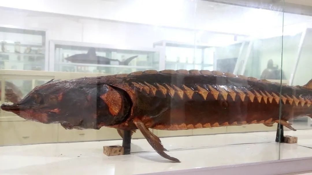 走进脊椎动物陈列室,横贯在门口“C位”的便是“水中大熊猫”中华鲟,它是一亿五千万年前中生代留下的稀有古代鱼类,属于国家一级重点保护动物。陈列在标本馆中的这条中华鲟于1983年采自洞庭湖,长达3.3米,重达500余斤,是很罕见的“大个子”。