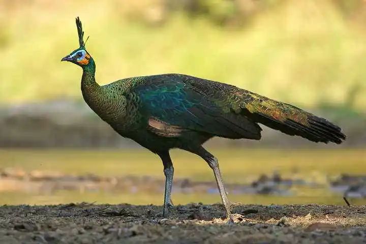 绿孔雀羽色极为华丽,雄鸟全长约140cm,雌鸟长约100cm,体重7~8kg,通体羽毛以翠绿色为主。雄鸟头顶耸立一簇冠羽,约11cm。冠羽中部辉蓝色而具翠绿羽缘;前部为鱼鳞状,呈辉亮的蓝绿色,有时具浅蓝紫色光泽。后颈、上背和胸呈金铜色,羽基暗紫蓝色,并具翠绿色狭缘,常部分显露于外,尤以下颈和胸为著。尾上覆羽多达100~150枚,并延长为尾屏,是雄鸟最具代表性的形态特征,尾羽较短而呈黑褐色,隐于尾屏之下。近羽端有椭圆形眼状斑。雌鸟无尾屏,亦远不如雄鸟羽色鲜艳。背部和腰部暗褐色,具黄铜色或绿色光彩。尾黑褐色,微缀褐白色横斑和羽端。眼周围具有浅钴蓝色裸区,颊部裸区呈鲜艳钴黄色。嘴峰黑褐色,下嘴较淡;跗蹠和趾黑色,雄鸟跗蹠后部具有一长距,是打斗的利器。
