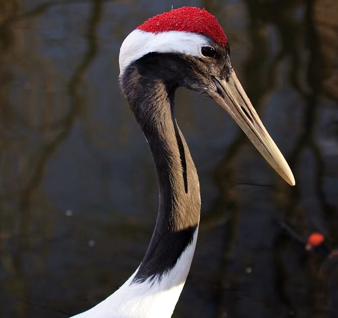 形态:丹顶鹤体长约160cm,翼展240cm,体重约7-10.5kg。全身几乎纯白色,头顶裸露无羽、呈朱红色,额和眼先端具黑羽,眼后方耳羽至枕白色,颊、喉和颈黑色。次级飞羽和三级飞羽黑色,三级飞羽长而弯曲,呈弓状,覆盖于尾上。嘴较长,呈淡绿灰色,尖端黄色。颈、腿也都很长,两翅中间长而弯曲的飞羽,为黑色,虹膜褐色,胫裸露部分和跗蹠及趾灰黑色,爪灰色。