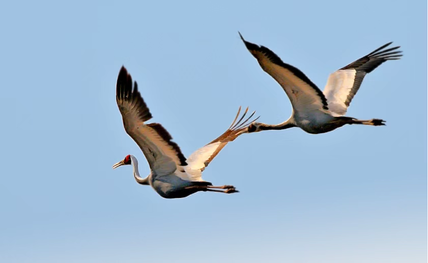 行为:除繁殖期成对活动外,多成家族群或小群活动,偶尔也见单独活动的,迁徙和越冬期间则多为数个或10多个家庭群组成的大群活动。行动机警,两翅扇动有力,飞行轻快。白枕鹤忠于爱情,恪守一夫一妻制,两只相爱的白枕鹤常常帮对方清理羽毛,甚至会有一些“亲吻”动作。