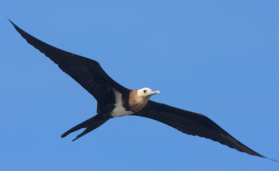 白斑军舰鸟主要栖息于热带海洋和海中的岛屿,通常成天在海面上空飞翔,很少看见它们在海上游泳或在地上行走,是一个不知疲倦的空中飞行者。