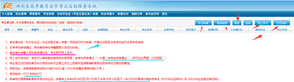 3.查询领取:网上支付成功后,如果查询审核状态是“自考处终审通过”,则可以在此界面打印《回执单》并准备好《补办申请单》的注意事项上的相关材料到湖南省教育考试院213办公室领取补办事宜。咨询预约电话:0731-88090373。