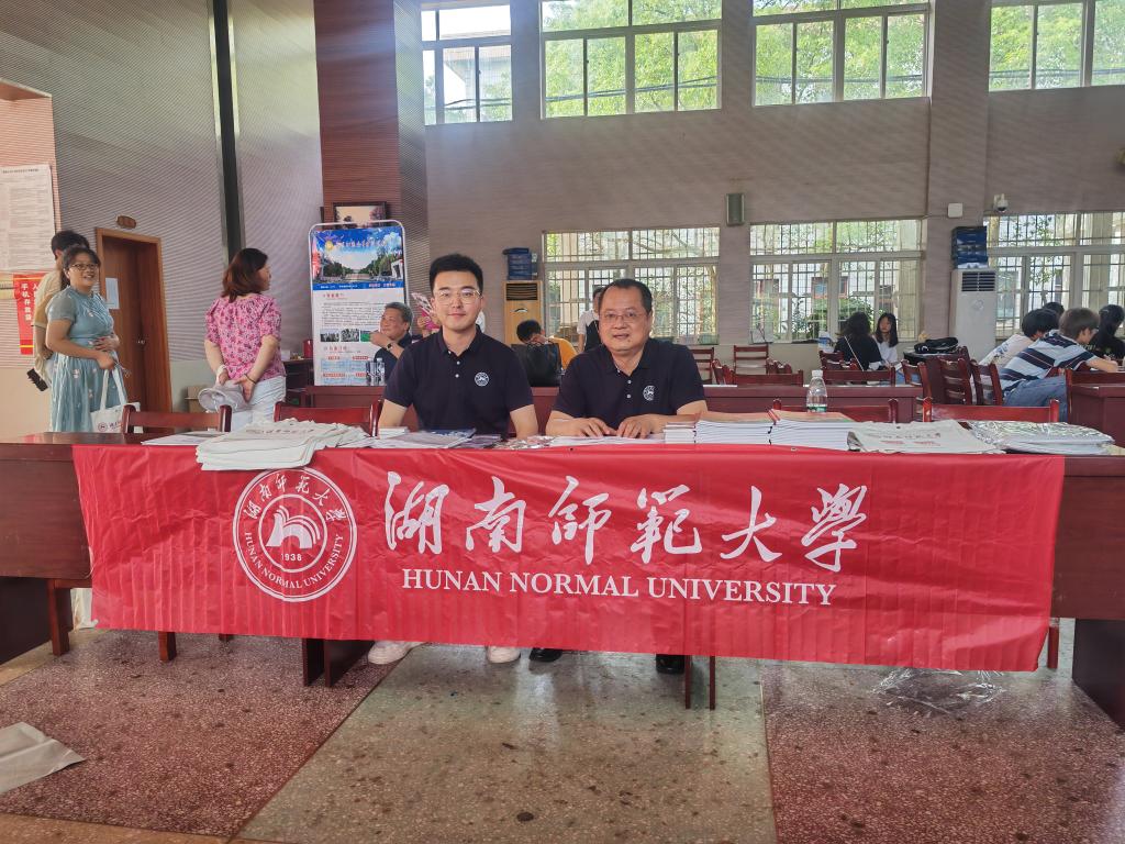 彭赛丰于6月26日带领2018级辅导员王洋到达江江市第一中学进行宣传,陈湘定于6月27日带领2019级辅导员李翠玲到达长沙县第一中学进行宣传。我院招生宣传工作组认真细致地向师生和家长们介绍了我校学校发展概况及2022年本科招生政策,耐心解答了学生和家长重点关心的报考事宜和专业选择等问题,并发放了大量招生宣传资料和文创纪念品,受到了师生和家长们的热烈欢迎,同学们纷纷表示希望自己有机会成功考取湖南师范大学。