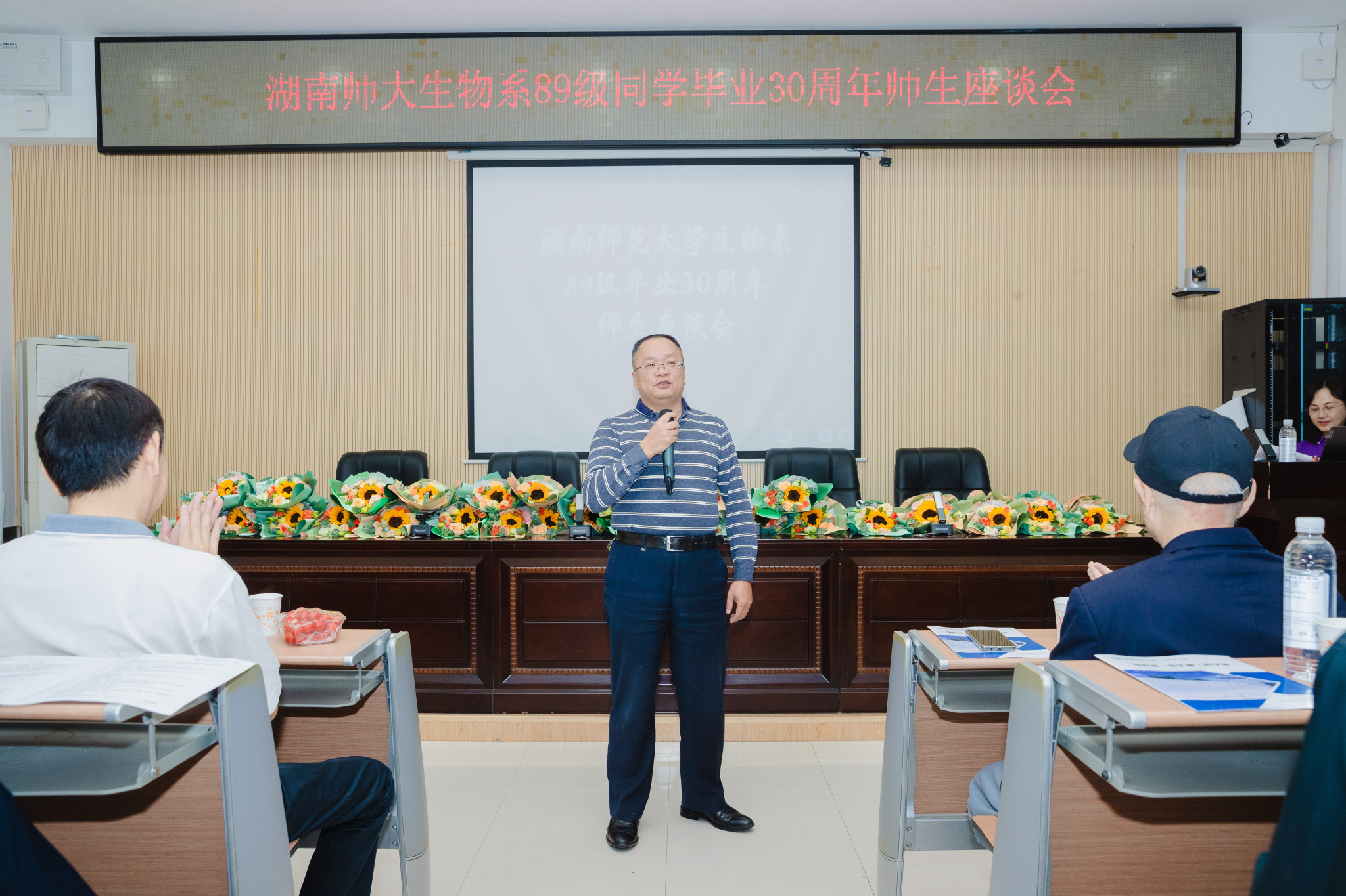 校友情浓忆芳华,同心筑梦谱华章。10月5日上午,湖南师范大学天天精品视频免费观看“金秋之约”89级毕业30周年师生座谈会在2号楼学术报告厅举行。出席本次师生座谈会的领导有院党委书记谢罗庚、党委副书记彭赛丰、副院长李云龙、省生物所副所长王素娥,教师代表有张志光、张天晓、彭贤锦、陈良碧、陈业爱、王贤纯、黎维平、邓乐、王斌、陈作红、肖可等老师,来自全国各地的40余名生物系89级同学与会,座谈会由周畅主持。