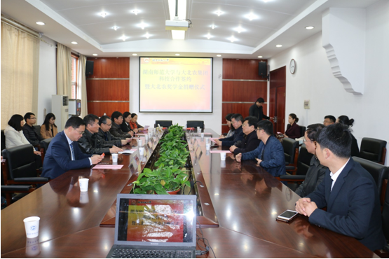 杨治平代表省科技厅对我校与大北农集团开展科技合作表示祝贺,并充分肯定了我校在科学研究、产学研结合方面所取得的成绩,希望我校加强与企业的联系与对接,为湖南经济和社会发展做出更大贡献。